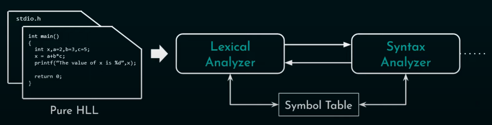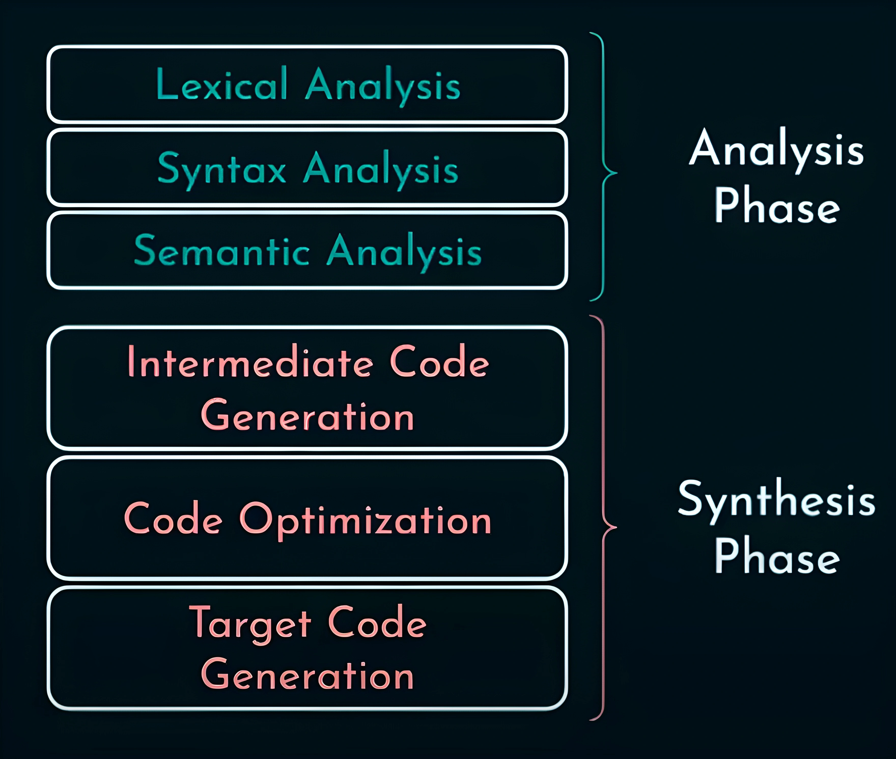 Durante la fase di analisi viene eseguita l’analisi lessicale, sintattica e semantica; nella fase di sintesi avviene la generazione del codice intermedio, l’ottimizzazione del codice e, infine, la generazione del codice macchina. Le varie fasi verranno analizzate nel dettaglio in seguito.